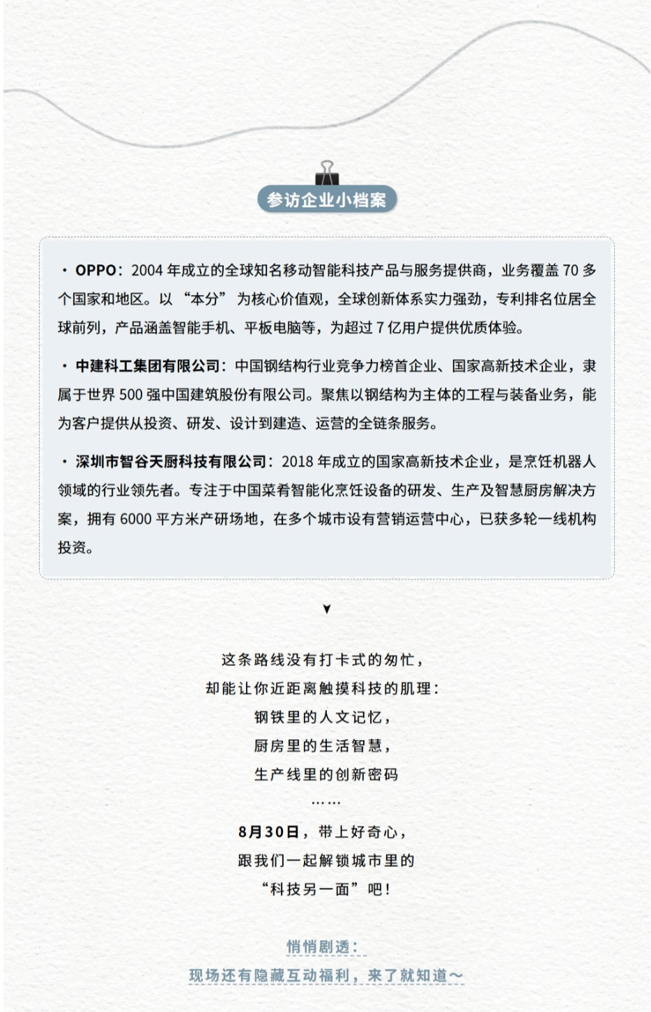本次路线更涵盖OPPO运动健康实验室、中建科工钢结构博物馆等科技地标,带你解锁深圳的创新基因。8月30日,和我们一起触摸钢铁的坚韧、感受数据的脉搏、品尝未来的味道,与智谷天厨共赴这场科技与生活的奇妙对话!